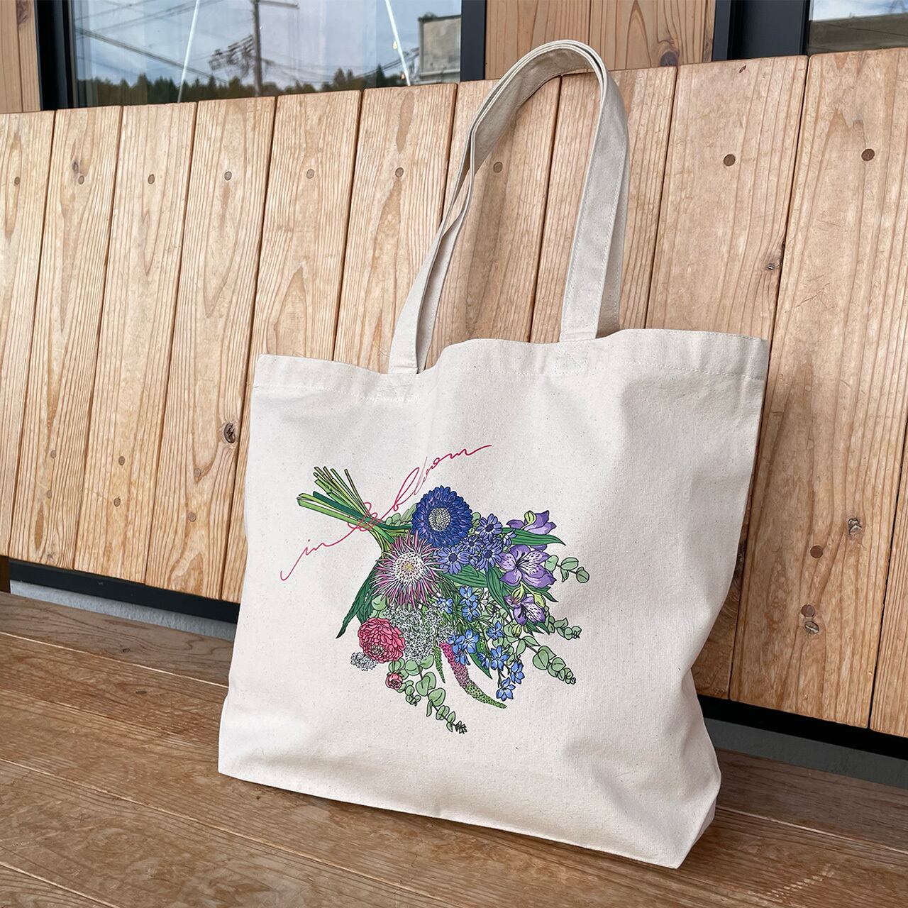 POP UPのメインビジュアルで描いた「in bloom」でトートバッグを作りました!